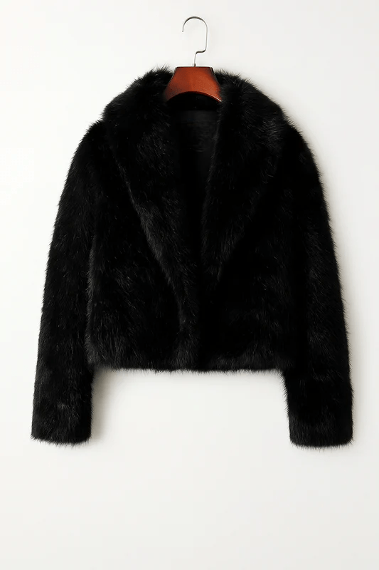 Das tiefschwarze, dichte Kunstfell verleiht der Jacke eine edle Textur und sorgt für kuschelige Wärme. Der klassische Schnitt mit breitem Revers macht sie zur idealen Wahl für elegante Abende und stilvolle Wintertage.