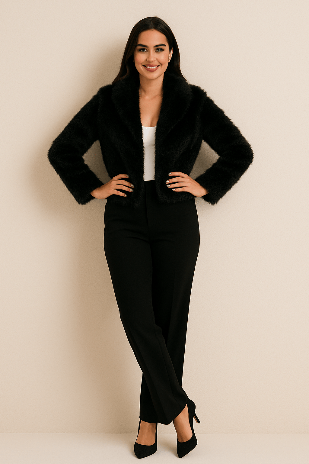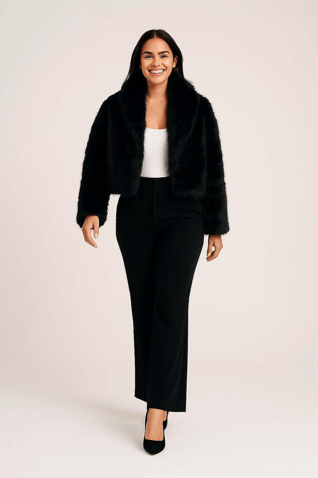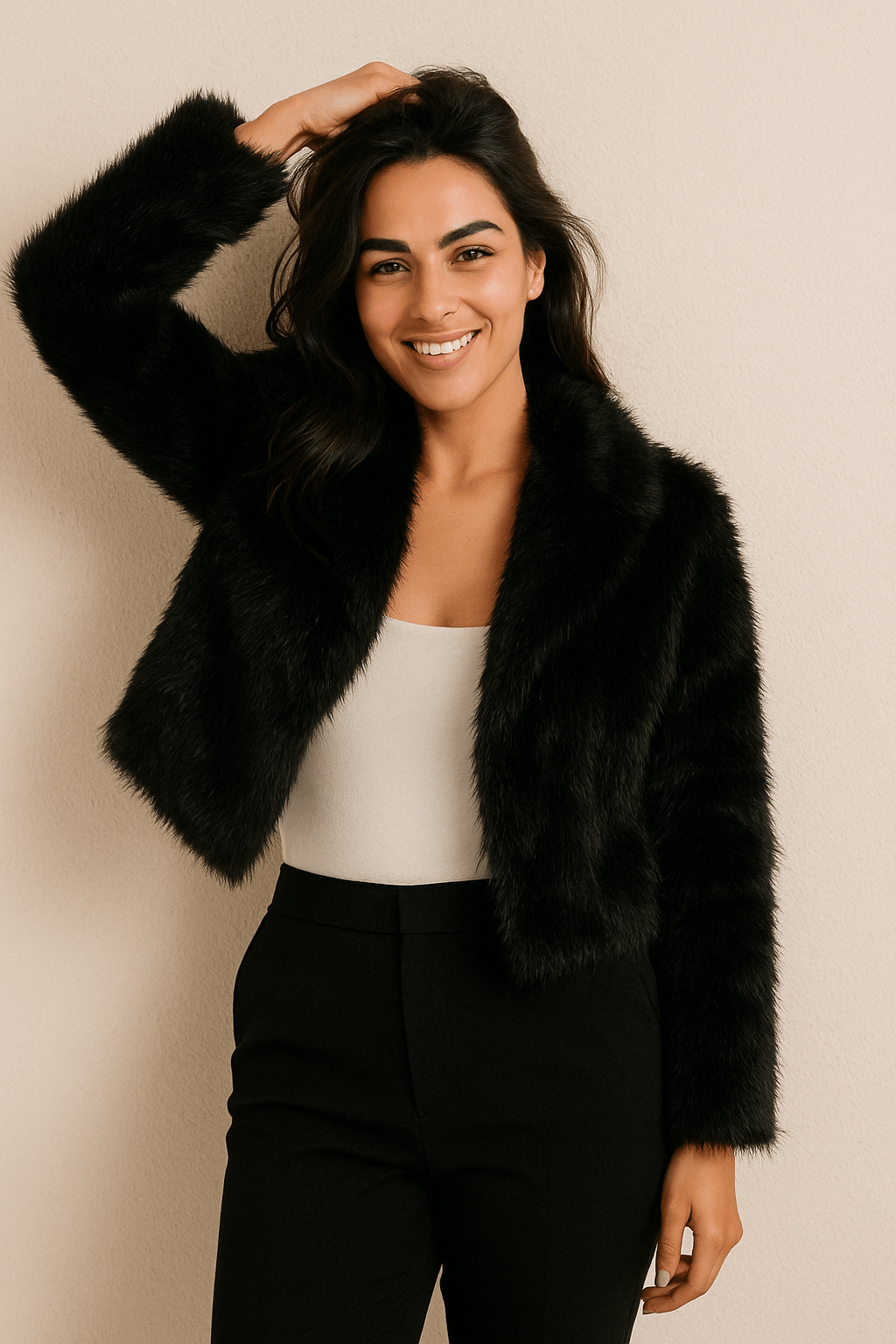 Glamour trifft Alltag – mit der Lara Kunstfelljacke Kurz als stilvolles Statement-Piece.